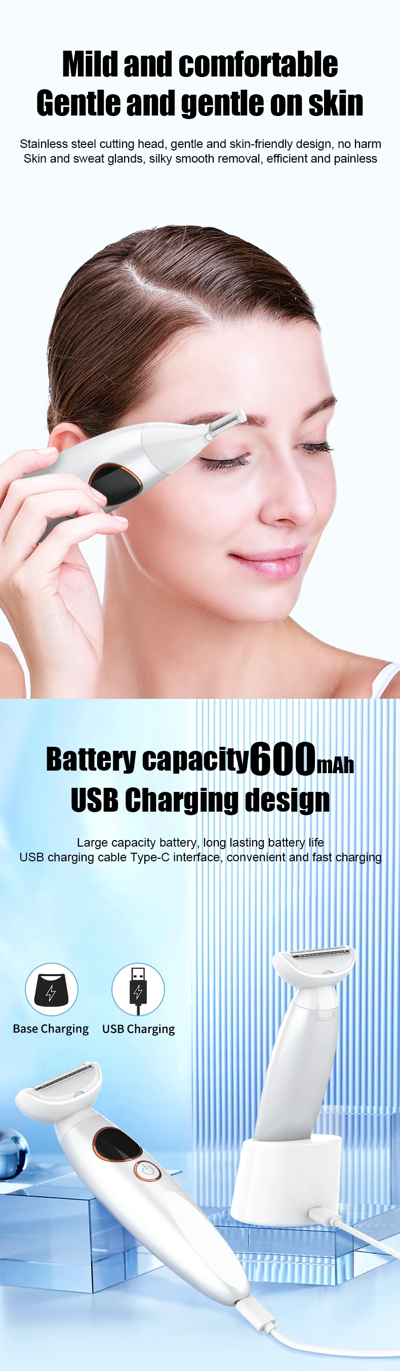 Mode d'emploi : Nous aidons les femmes les hommes et à se sentir plus confiants, à l'aise et en bonne santé. Avant la première utilisation, chargez complètement votre tondeuse. Tendez bien la peau et coupez lentement et régulièrement sur la zone sensible, sinon vous risquez d'abîmer les plis cutanés sans le guide-peigne.